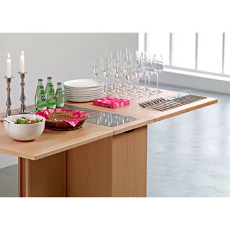 The Esprit Contemporary Dining Table is multi-functional with two lift-up leaves--which when lifted can seat from three to six persons. The reversible center tabletop is covered in stainless steel on one side, making it tolerant to hot objects. Extra storage space is available beneath the reversible tabletop. The large drawer of the dining table has two wire shelves that provide excellent storage place.