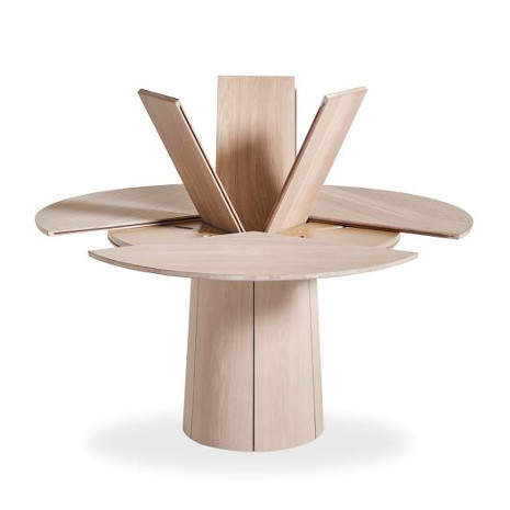 Our Daisy Dining Table has a unique patented leaf extension that stores 3 folding leaves in the base.