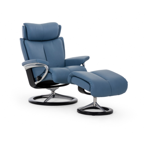 Fall under the spell of the newest recliner from the innovators of comfort. Forty years of design expertise coupled with the very latest advancements in furniture making technology result in pure Magic (in small, medium, and large sizes)! Extraordinarily luxe cushioning and carefully sculpted proportions make the Stressless® Magic our most comfortable recliner yet. Using the Stressless patented Glide®, and Plus® systems, Magic responds to your bodies slightest movement. Coupled with an adjustable headrest, the Stressless Magic delivers superior support and unprecedented comfort. Today, the first ergonomically designed recliner remains the best.